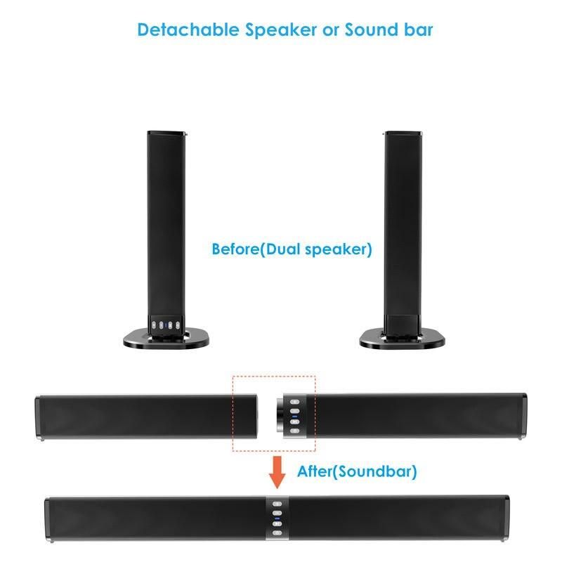 Our soundbar stands out with its innovative detachable design, allowing you to enjoy the versatility of using it as a single horizontal unit or two separate vertical speakers. This flexibility makes it perfect for any room layout, ensuring optimal sound distribution. With an SNR of 80dB and a frequency response of 20Hz – 20KHz, it delivers crystal-clear, room-filling sound. Additionally, the built-in microphone makes it perfect for hands-free calls or voice commands, adding to its wide array of functionalities.